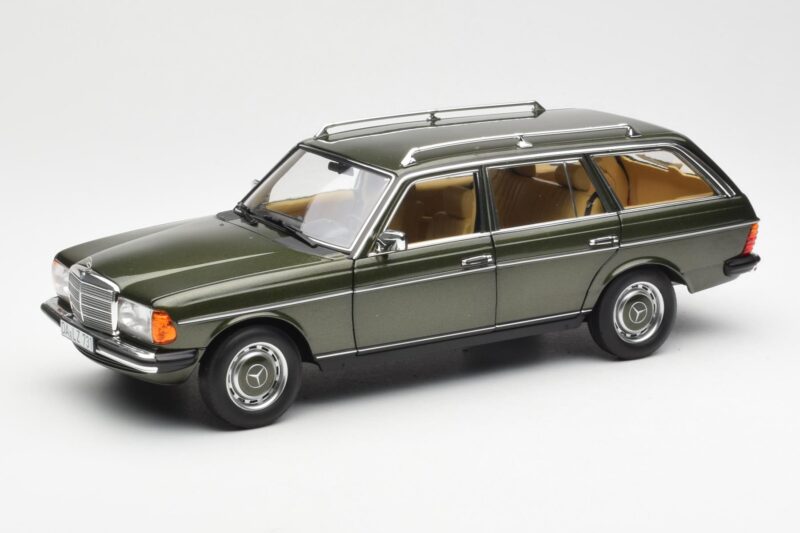 The Mercedes 230T W123 T-Model Roheline Metallik Norev 1:18 is crafted from Metall. Die-cast zinc alloy body with detailed plastic parts, rubber tires, and high-quality paint finish. Die-cast models are known for their weight, durability, and realistic feel.