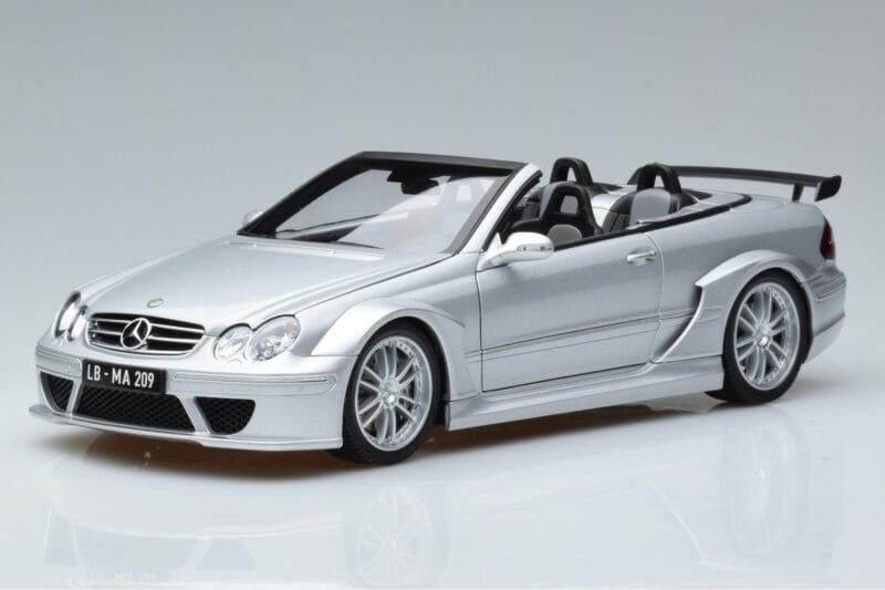 The Mercedes CLK DTM AMG W209 Kabriolett Hõbedane Kyosho 1:18 is crafted from Metall. Die-cast zinc alloy body with detailed plastic parts, rubber tires, and high-quality paint finish. Die-cast models are known for their weight, durability, and realistic feel.