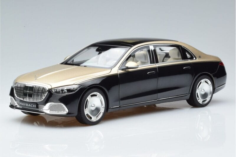 The Mercedes Maybach S680 X223 Kuldne Must Metallic Norev 1:18 is crafted from Metall. Die-cast zinc alloy body with detailed plastic parts, rubber tires, and high-quality paint finish. Die-cast models are known for their weight, durability, and realistic feel.