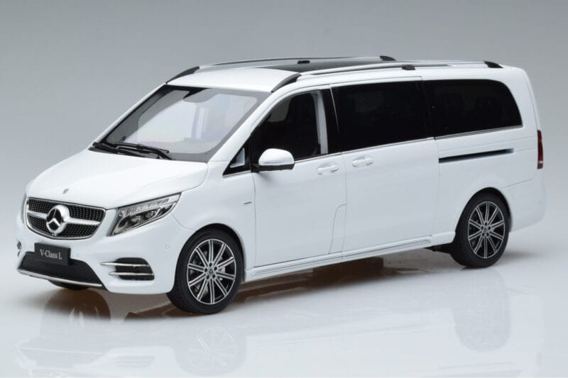 The Mercedes V-Class W447 V260L Valge Mercedes 1:18 is crafted from Metall. Die-cast zinc alloy body with detailed plastic parts, rubber tires, and high-quality paint finish. Die-cast models are known for their weight, durability, and realistic feel.