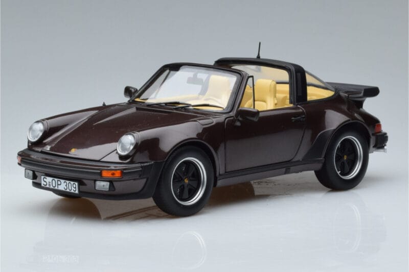The Porsche 911 964 Turbo Targa Pruun Norev 1:18 is crafted from Metall. Die-cast zinc alloy body with detailed plastic parts, rubber tires, and high-quality paint finish. Die-cast models are known for their weight, durability, and realistic feel.